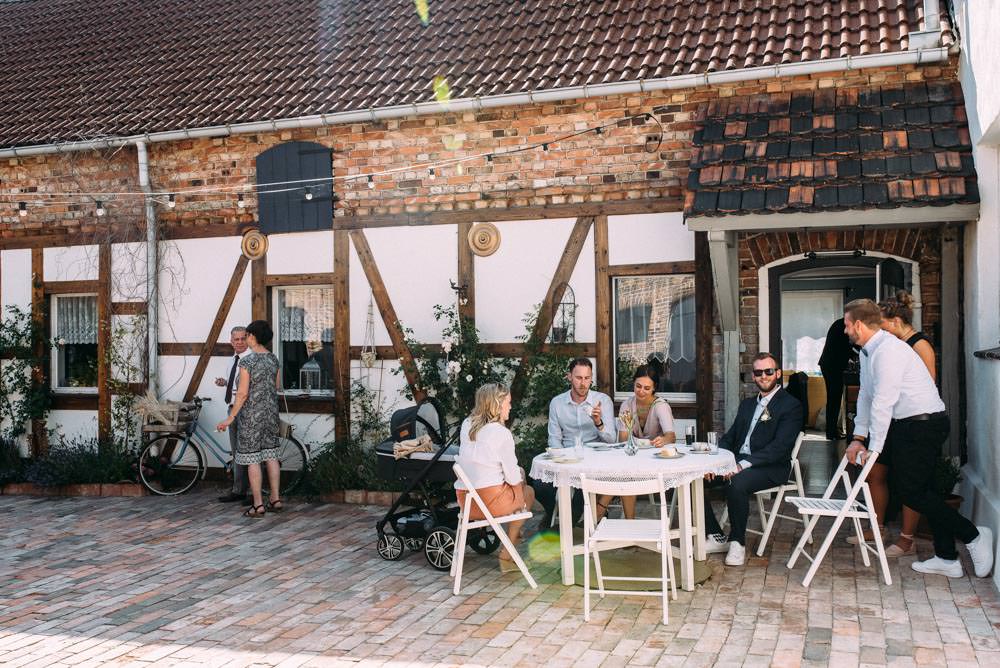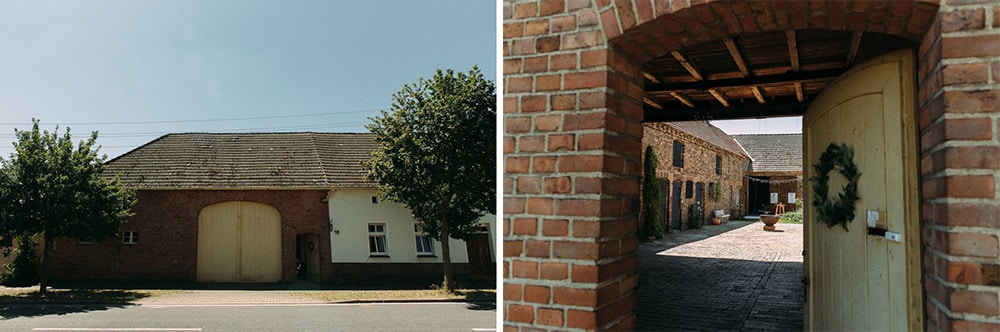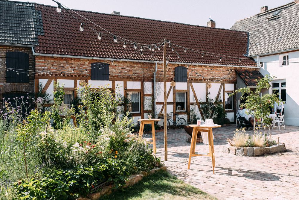 Von der Straße aus noch unscheinbar, ewartet euch im Innenhof ein idyllischer Vierseitenhof mit Fachwerk, roten Ziegelmauern, eine Scheune, Lichterketten, Blumenbeeten und ganz wichtig: viel Schatten! Im Sommer gibt`s nichts Wichtigeres. 🙂