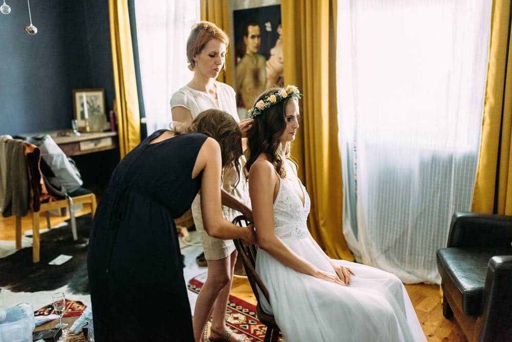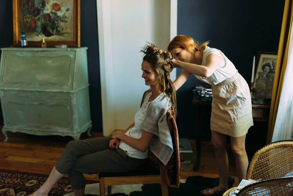 Victoria und Dominik konnten sich umgeben von Freunden, direkt in der Location zurecht machen. Meiner Meinung nach die beste Art Vorbereitung am Tag der Hochzeit. Das sorgt für gute Stimmung und beruhigt die Nerven.