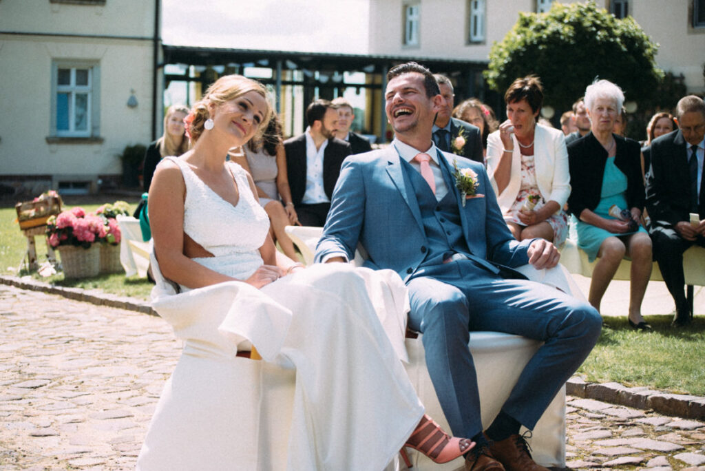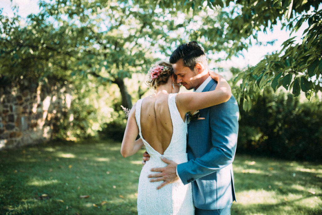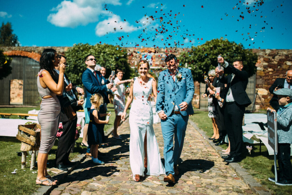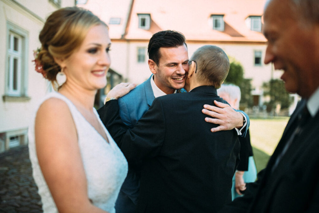 Aber jetzt mal zurück, zu dieser Hochzeit: Wir ihr seht, hatten wir super Wetter und somit konnte die Freie Trauung im Gut Haferkorn nur perfekt werden. Was mir ganz besonders gut gefiel, war die moderne Inszenierung durch Franzi und Sebastian. So ein Kleid hatte ich bis jetzt auch noch nie gesehen. Schaut mal bei Schleifenfänger in Leipzig vorbei. Dieses Unikat gibt es nirgendwo anders. In Kombination mit Sebastians Anzug und dem Hochzeitsstrauß im Spätsommer-Look wirkt diese Hochzeit frisch und inspirierend neu.